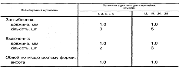 Нерівномірність кольору відхилення від норми не рахується. На поверхні спринцівок не допускаються тріщини, розриви та відхилення по розмірам і кількості, які перевищують величини дані в таблиці 2.