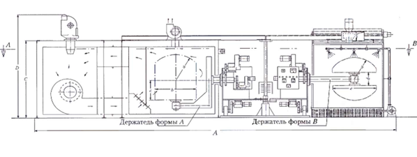 На мал. 1 представлена сучасна установка, на якій можлива переробка будь-якої придатної для ротаційного формування сировини, наприклад, ацетобутирату целюлози, пропионата целюлози, НС і таких мономірних початкових речовин. У форму завантажується полімерна сировина, і при нагріві починається обертальння в двох площинах. Після нагріву (тривалість від 5 до 25 хвилин залежить від товщини стінок виробу) процес розплавлення завершується. Попередня підготовка форми полягає в ретельному чищенні, наприклад, при допомозі трнхлорэтилена (використовуйте засоби захисту органів дихання!) з наступним продуванням. Потім наносится термостабільний силіконовий лак (рівномірне нанесення тонким шаром), котрий піддається термообробці при температурі від 350 до 400 СС. Другий дуже тонкий лаковий шар значною мірою підвищує термін служби форм капролактам, який при додаванні ініціаторів у формі в результаті полимеризацій перетворюється на ПА 6.