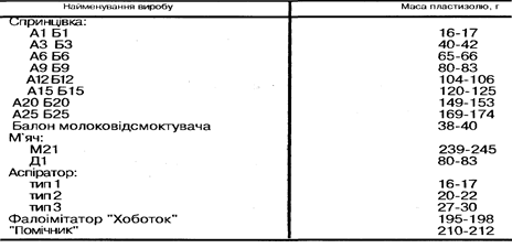 Спринцівки типу А та алони до спринцівок типу Б виготовляють з ПВХ пластизолю Рецептура якого наведена в наступних розділах. Наконечики виготовляються з поліетилену. З’єднання балона типу Б з наконечником повинно бути герметичним.
