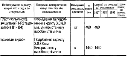 В регламенті перечислюються всі можливі відходи підприємства, їх використання, місця складу і способи знищення. При порушені технологічного регламенту кількість відходів збільшується. Наприклад. При відключені від температурного режиму в процесі переробки пластмас в вироби проходить розкладання полімеру з виділенням токсичних газоподібних речовин, які можуть утворювати аварійні викиди, які призводять до загазованості оточуючого середовища, або можуть створювати надлишковий тиск, який здатний розірвати апаратуру, трубопроводи і навіть викликати вибух.