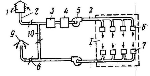 4 – калорифер; 10 – повітропроводи для рециркуляції;