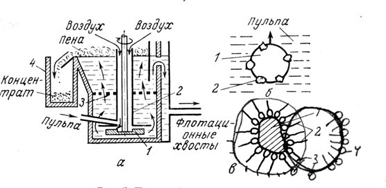Из верхней части разделительной камеры непрерывно отводится минерализованная пена, содержащая концентрат; из нижней, - через порог 6, в промежуточную камеру 7 выводятся хвосты в виде пульпы.
