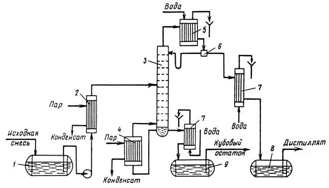 4 – кипятильник; 5 – дефлегматор; 6 – делитель флегмы; 7 – холодильник; 8 – сборник дистиллята; 9 – сборник кубового остатка