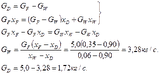 где GF , GD ,, GW – производительность по исходной смеси, дистиллята и кубового остатка; XF , XD , XW – содержание легколетучего компонента в исходной смеси, дистилляте и кубовом остатке, массовые доли.