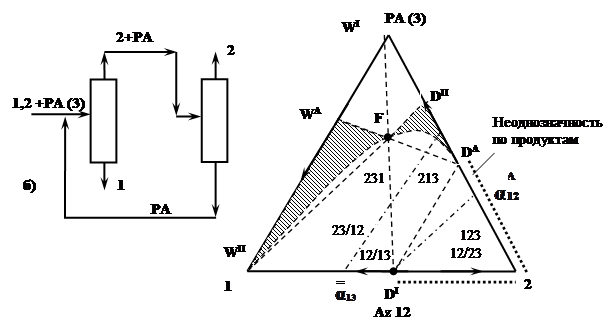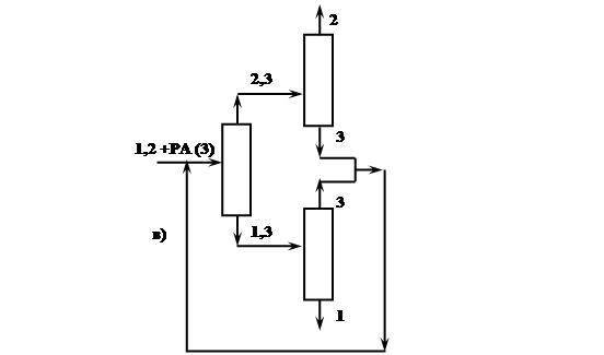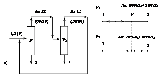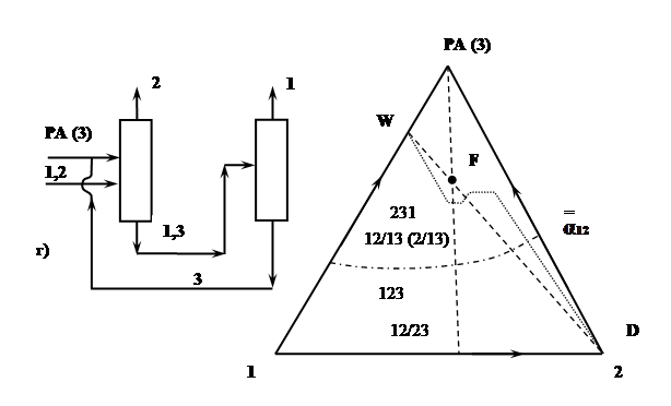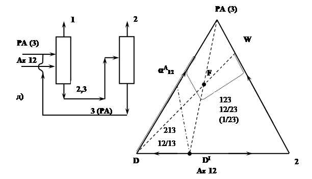 Рис.10. Схемы узлов разделения азеотропной бинарной смеси 12 с минимумом температуры кипения и графы соответствующих концентрационных пространств: а – двухколонный агрегат, работающий при различных давлениях в колоннах; б, в – схемы с разделяющим агентом с промежуточной температурой кипения; г, д – схемы экстрактивной ректификации.