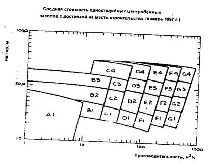 Тип насоса определяем по номограмме (рисунок 7, п.3.2), по значениям производительности и напора, а по типу насоса определяем стоимость.