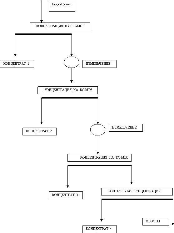 Опыты по гравитационному обогащению проводили на лабораторном центробежном концентраторе Нельсона KC-MD3 в комплекте с вибропитателем. Первую стадию обогащения проводили на сухом материале, подаваемом в концентратор с помощью вибропитателя. Хвосты 1-й стадии обогащения доизмельчали в стержневой мельнице фирмы KNELSON GRAVITY SOLUTION и возвращали в концентратор в виде пульпы. Хвосты 2-й стадии обогащения вновь доизмельчали в стержневой мельнице и т.д. Количество стадий измельчения составляло в разных опытах от 1 до 3, количество стадий обогащения от 1 до 5, включая контрольную операцию (рис. 11.5.1).