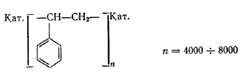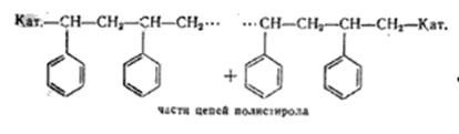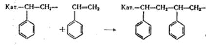Затем активные частицы активируют следующие молекулы стирола II соединяются с ними, образуя цепь (следующая стадия):