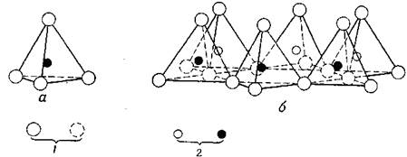 Рис. 1.1. Схематическое изображение отдельного кремнекислородного тетраэдра (а) и сетки кремнекислородных тетраэдров, расположенных по гексагональному мотиву (б): 1 – атомы кислорода; 2 – атомы кремния