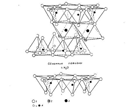 Во взаимном расположении кремне- и алюмокремнекислородных слоев слои атомов кислорода каждого структурного элемента являются смежными со слоями атомов кислорода соседних структурных элементов, вследствие чего между ними существует очень слабая связь и в минерале наблюдается прекрасная спайность. Характерной особенностью структуры монтмориллонита является то, что молекулы воды и другие полярные молекулы, например некоторые органические молекулы, могут проникать между структурными слоями, вызывая расширение решетки в направлении оси с. В связи с этим величина периода с не является постоянной, а изменяется, начиная примерно с 9,6 Å , когда между структурными слоями нет никаких полярных молекул, до полного, в некоторых случаях материального разобщения отдельных слоев. На рис. 3. схематически изображена структура монтмориллонита такого типа. Обменные катионы находятся между силикатными слоями, и межплоскостное расстояние вдоль оси с полностью дегидратированного монтмориллонита в некоторой степени зависит от размера межслоеных катионов: оно тем больше, чем больше по своим размерам катионы. В случае адсорбции полярных органических молекул между силикатными слоями величина периода с также изменяется и зависимости от размера и геометрии органической молекулы. Толщина водных слоев, расположенных между силикатными структурными слоями, при данном давлении паров воды зависит от природы обменных катионов.