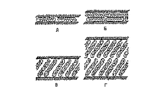 Рис. 1.2. Схематическое сдвоенных цепей кремнекислородных тетраэдров, характерных для амфиболевого структурного типа глинистых минералов. а – в перспективе;