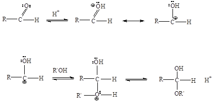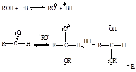 Возможно образование соединений, содержащих один алкоксильный остаток -OR’ (полуацетали, полукетали) или два - ацетали, кетали. Образование полуацеталей катализируется и кислотами, и основаниями: