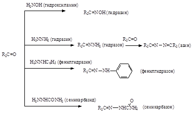 Многие другие производные аммиака также дают с альдегидами и кетонами аналогичные продукты конденсации. К таким производным относятся гидроксиламин (NH2 OH), гидразин (NH2 -NH2 ), фенилгидразин (NH2 -NHC6 H5 ) и семикарбазид (NH2 -NHC(O)NH2 ). Продукты их конденсации с карбонильными соединениями называются соответственно оксимами, гидразонами, фенилгидразонами и семикарбазонами: