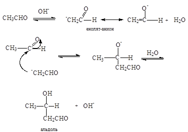 Катализируемая основаниями альдольная конденсация начинается с образования енолят-иона альдегида. Поскольку енолят-ион является нуклеофилом, следующей стадией является атака енолят-ионом карбонильной группы другой молекулы альдегида. В результате образуется алкоксид-ион. Далее происходит протонирование алкоксид-иона водой, при этом образуется конечный продукт - альдоль (3) и регенерируется катализатор (ОН - ). Это происходит потому, что алкоксид-ион является более сильным основанием, чем гидроксид-ион.