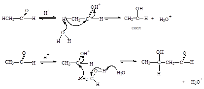 Механизм альдольной конденсации, катализируемой кислотами, включает две основных стадии: превращение кето-формы альдегида в енольную форму и атака образовавшимся енолом карбонильной группы альдегида: