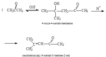 Кетоны вступают в альдольную конденсацию значительно труднее, чем альдегиды. Однако, при катализе кислотами образующийся в небольших количествах 4-окси-4-метил-пентан-2-он (продукт альдольной конденсации) будет быстро дегидратироваться в 4-метил-3-пентен-2-он (мезитилоксид):