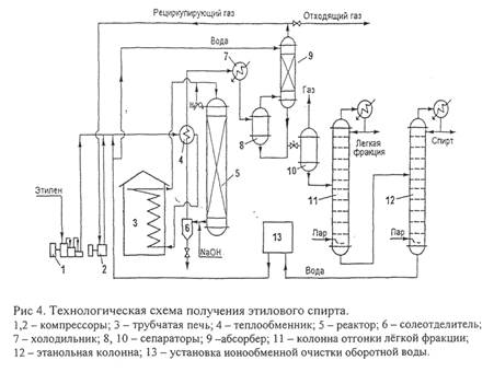 Имеются и другие пути, предотвращающие появление водяного конденсата. Во-первых, это повышение температуры. Однако, в силу экзотермичности процесса, этот путь принципиально непригоден, т.к. приводит к снижению конверсии этилена и интенсификации побочных процессов. Во-вторых, это снижение парциального давления паров водяного пара за счет повышения парциального давления этилена. Однако, этот путь тоже непригоден. Он также приводит к снижению выхода этанола, т.к. оптимальным соотношением между реагирующими компонентами является эквимолярное. Мольное соотношение, используемое в промышленности, этилен – пары воды равно 1 : 0,6-0,8.