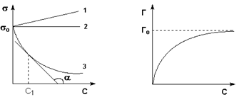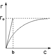 8. На рисунке справа изображена изотерма адсорбции поверхностно-активного вещества на границе раствор-пар, Г – число молей поверхностно-активного вещества в поверхностном слое, Г0 – максимально возможная концентрация поверхностно-активного вещества в поверхностном слое, на рисунке слева изображены изотермы поверхностного натяжения ПАВ (1, 2) и поверхностно-инактивного вещества/
