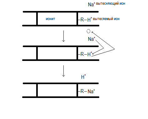 Процесс ионного обмена выглядит следующим образом. Вначале ион, содержащийся в растворе – он называется вытесняющий ион – попадает на поверхность ионита, потом диффундирует в объём ионита туда, где происходит акт обмена. Вытесняемый ион диффундирует из объёма ионита к его поверхности и переходит в раствор.