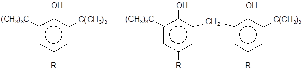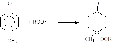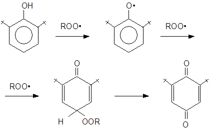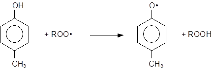 Пространственно-затрудненные фенолы (и получающиеся из них феноксильные радикалы) полностью удовлетворяют требованиям, предъявляемым к сильным антиоксидантам, и являются эффективными ингибиторами процессов окисления различных органических материалов. Подобные фенолы, как правило, реагируют с радикалами ROO•, прерывая цепь окисления.