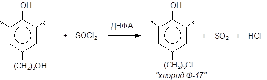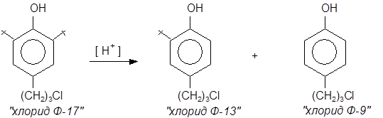 В качестве катализатора используют минеральные кислоты (H2 SO4 , HClO4 ) или КУ-2 (катионно-обменная смола, Н-форма). Процесс ведут до почти полной конверсии исходного хлорида Ф-17, так как эффективного метода очистки целевого хлорида Ф-13 от остатков хлорида Ф-17 не существует. Хлорид Ф-9 хорошо растворяется в щелочах и его отмывают 5%-ным раствором гидроксида натрия NaOH. Продукт перегоняют под вакуумом (ост. давление 1-2 мм рт. ст.). Потери, за счёт протекания побочного процесса деалкилирования хлорида Ф-13 и образования хлорида Ф-9, составляют не менее 30%.Полученный хлорид Ф-13 (4-(g-хлорпропил)-2-трет.-бутилфенол) конденсируют с параформом в течении двух часов при 80°С (растворитель: уксусная кислота). Выход 70% от теоретического. Хлорид Ф-13 (4-(g-хлорпропил)-2-трет.-бутилфенол) используется как сырье при получении 4-(g-меркаптопропил)-2-трет.-бутилфенола и 2,2’метилен-бис-[4-(g-меркаптопропил)-6-трет.-бутилфенола].
