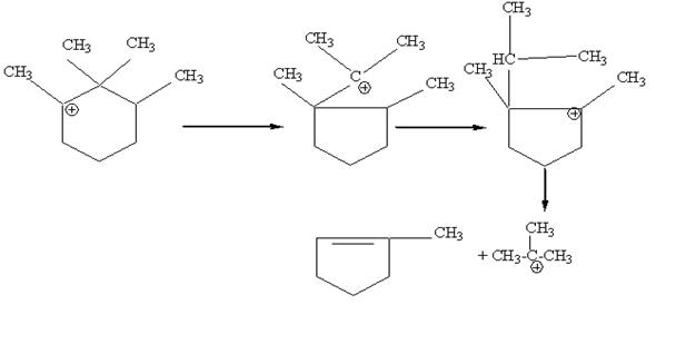 Особенностью этих реакций является отщепление С3 и боковых цепей меньшего размера. Сюда входит миграция алкильных групп с формированием С4 и более крупных ионов алкил карбония, которые затем отщепляются от кольца циклопарафина. Формирование ионов карбония из промежуточных соединений олефинов с последующей изомеризацией для формирования более стабильного иона карбония происходит в соответствии с ранее описанным механизмом гидрокрекинга нормальных парафинов. Соответственно, в продукте гидрокрекинга наблюдается высокое соотношение метилциклопентана к циклогексану.