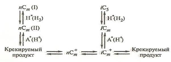 пСт (I) - парафин; пСт (II) - олефин; nСm + - карбоний-ион; Н* - гидрирующие, дегидрирующие центры; А* - кислотные центры; iC5 изопентан