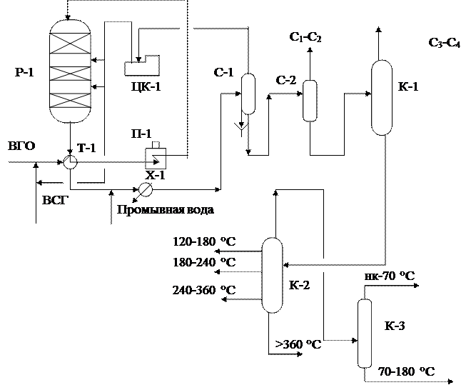 Широкая бензиновая фракция нк-180 °C проходит вторичную ректификацию в колонне К-3. Данная схема предпочтительна, когда остаток предполагается использовать как сырьё каткрекинга, пиролиза или для производства высокоиндексных базовых масел. Тем не менее такой вариант обеспечивает конверсию сырья на уровне от 50 до 80 % ( с применением современных катализаторов) с высокой селективностью по средним дистиллятам. Принципиальная технологическая схема данного процесса представлена на рисунке 3.