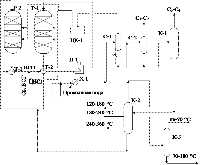 последующим разделением ГПС в сепараторе высокого давления С-1, сепараторе низкого давления С-2. Далее жидкий гидрогенизат из сепаратора С-2 проходит стабилизацию в колонне К-1, а затем поступает в основную фракционирующую колонну К-2.