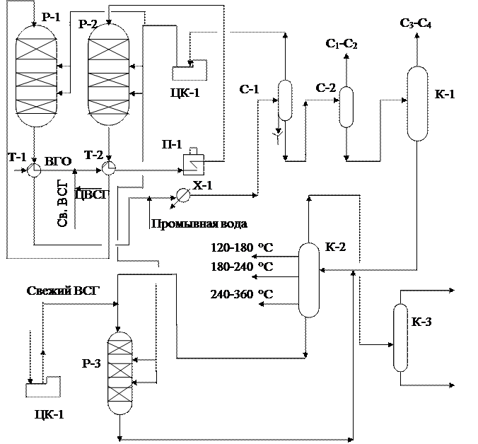 в реактор Р-2. Схема предполагает наличие двух последовательных реакторов, в первом из которых происходит предварительная гидроочистка сырья, которое затем поступает во второй реактор, где осуществляютя реакции крекинга. Конверсия сырья при работе по такой схеме может достигать практически 100 %. Преимущество данной схемы перед предыдущей бóльшая гибкость в работе, более высокие выходы лёгких фракций. В то же время установки данного типа позволяют иметь более высокую пропускную способность по сырью. Недостаток–увеличение стоимости установки и эксплуатационных затрат ( в связи с увеличением затрат на компримирование ВСГ, на циркуляцию и регенерацию раствора моноэтаноламина, на рециркуляцию не превращенного остатка первой стадии). Величина конверсии за проход составляет от 50% до 70 %. Принципиальная технологическая схема данного процесса представлена на рисунке 3.