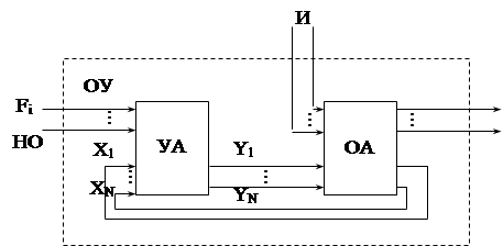 Связи между операционным и управляющим автоматами организуются так. Сигналы с выходов управляющего автомата подаются на его же входы, а также на входы операционного автомата. На входы управляющего автомата подаются также сигналы логических условий. Каждая микрооперация выполняется строго при поступлении синхроимпульса и при подаче соответствующего управляющего сигнала, который в свою очередь вырабатывается на основе сигналов логических условий, вычисленных в предыдущий такт работы операционного устройства.