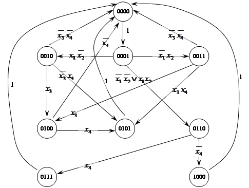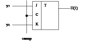 Далее, когда на входы управляющего автомата приходит сигнал Y5 и сигнал из ГСИ, триггеры управляющего автомата обнуляются, то есть T1 =0, T2 =0, T3 =0, T4 =0, а на выходе дешифратора вырабатывается сигнал Y0 (см. общую схему), который означает, что операционное устройство готово к выполнению следующего цикла операции арифметического сложения чисел с фиксированной запятой в обратных двоичных кодах.