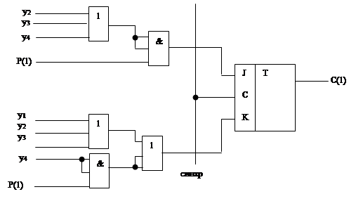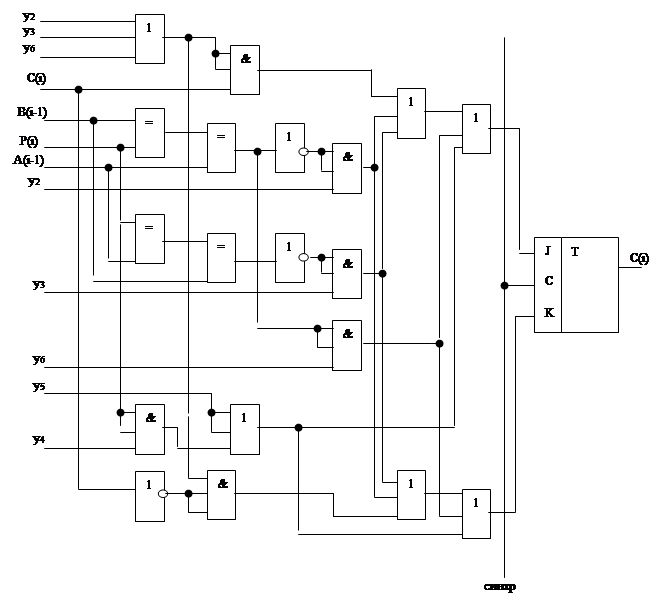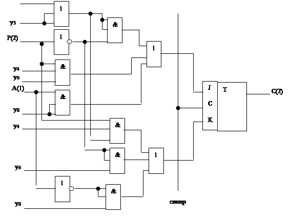 =0, под действием этих сигналов и при поступлении синхроимпульса из генератора синхроимпульсов (ГСИ) триггеры управляющего автомата переходят в состояния: T1
