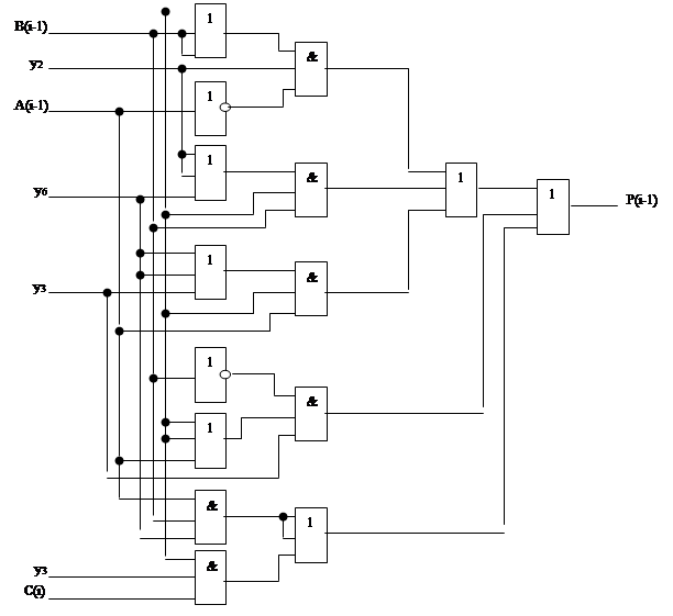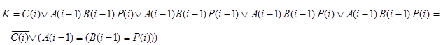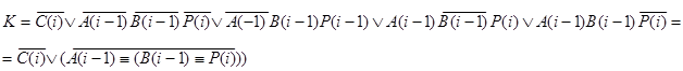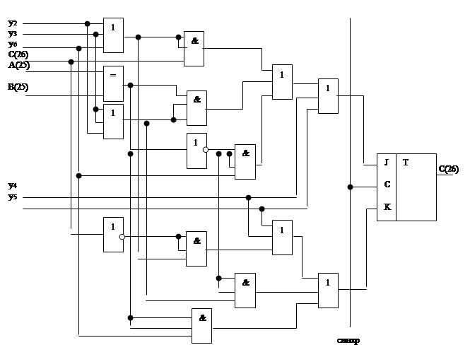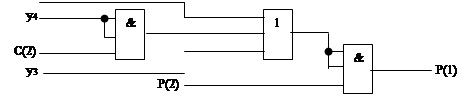 Которая заключается в следующем. Полю С(1) присваивается значение переноса в этот разряд P(1), который можно вычислить по схеме на рис. 2.2.5., а схема С(1) изображена на рис. 2.2.1. Полю С(2) присваивается значение инверсии переноса в этот разряд P(2) (рис. 2.2.7.), схема С(2) изображена на рис. 2.2.3. На поле С(3:25) происходит присвоение C(i) суммы B(i-1), инверсии A(i-1) и переноса P(i)(схема для С(i) на рис. 2.2.6., а для P(i) на рис. 2.2.7), где i = 3-25. Но перенос P(25) определяется иначе, на основе схемы рис. 2.2.11. На поле С(26) происходит подобная операция (С(26):=А(25)+В(25)) только без учета переноса, так как его не может быть (С(26) – последний разряд), схема дана на рис. 2.2.10. В результате этой микрооперации слово С принимает следующий вид: С=01.1001010