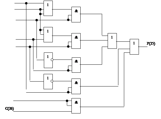 При этой микрооперации значения полей С(1) и С(2) не меняются, см. соответственно рис. 2.2.1.и рис. 2.2.3. Разрядам полей С(3:25) и С(26) присваивается значение инверсии этих разрядов, что можно вычислить из схем на соответственно рис. 2.2.6. и рис. 2.2.10. Тогда в данном примере значение слова С будет таким: С=01.0110101