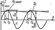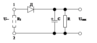 Амплитудный преобразователь с открытым входом (рис.2, а) представляет собой последовательное соединение вакуумного диода Д с параллельно соединенными резистором Л? и конденсатором С. Если к зажимам 1—2 приложено напряжение u = Um sinwt от источника с внутренним сопротивлением ri , то конденсатор через диод заряжается до некоторого значения Uc , которое приложено к электродам диода так, что он большую часть периода закрыт, т. е. работает в режиме отсечки (рис. 2, б). В течение каждого периода диод открывается на некоторый промежуток времени 't1 - 't2 тогда и > U c и конденсатор подзаряжается импульсом тока iД до напряжения Uc • постоянная времени заряда tз = (Ri +RД ) С, где R Д — сопротивление открытого диода. Затем диод закрывается и конденсатор разряжается через резистор R в течение интервала t2 - 't1 постоянная времени разряда tp = RC.