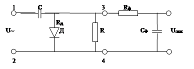 Амплитудный преобразователь с закрытым входов (рис. 3) представляет собой последовательное соединение конденсатора постоянной емкости С с параллельно соединенными диодом Д и резистором R. Процесс преобразования переменного напряжения в постоянное Uпик аналогичен рассмотренному выше, с тем отличием, что на зажимах 3—4 имеются значительные пульсации напряжения, для сглаживания которых предусмотрен фильтр.