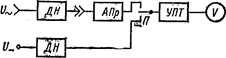 Вольтметр амплитудного (пикового) значения (рис.1) состоит из амплитудного преобразователя АПр, усилителя постоянного тока УПТ и магнитоэлектрического индикатора, градуированного в вольтах. На входе вольтметра иногда предусматривается делитель напряжения ДН. Амплитудный преобразователь выполняют по схеме с открытым или закрытым входом.