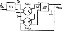 Вольтметр среднеквадратического (действующего) значения строится по структурной схеме рис.6. Применяются преобразователи с квадратичной характеристикой, обеспечивающей измерение среднеквадратического значения напряжения любой формы. К таким преобразователям относятся, в первую очередь, термоэлектрические и оптронные. На базе термоэлектрических преобразователей (см. рис-. 3-15, г) создан преобразователь среднеквадратического значения [б], работающий на двух идентичных элементах ТПр1 и ТПр2 (рис. 7) и дифференциальном усилителе ДУ (микросхеме). Нагреватель первого термопреобразователя подключен к выходу широкополосного усилителя, т. е. в цепь измеряемого напряжения Ux, а нагреватель второго — к выходу дифференциального усилителя ДУ, т. е. в цепь отрицательной обратной связи. ТермоЭДС первого преобразователя Ет 1 =aт U2 x второго — Ет 2 =aт U2 вых , где Ux и (Uвых —среднеквадратические значения измеряемого и выходного напряжений соответственно.