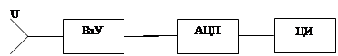 Цифровые электронные вольтметры. Принцип работы вольтметров дискретного действия состоит в преобразовании измеряемого постоянного или медленно меняющегося напряжения в электрический код, который отображается на табло в цифровой форме. В соответствии с этим обобщенная структурная схема цифрового вольтметра состоит из входного устройства ВхУ, аналого-цифрового преобразователя АЦП и цифрового индикатора Ц И.