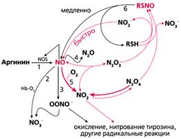Рис.1. Схема биосинтеза NO и основные метаболические пути оксидов азота.