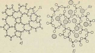 Стеклообразующий каркас стекла представляет собой неправильную пространственную сетку, образованную кремнекислородными тетраэдрами [SiO4 ]4- . На рис. 8 (а) показана такая сетка кварцевого стекла. При частичном изоморфном замещении кремния в тетраэдрах, например, на алюминий или бор, образуется структурная сетка алюмосиликатного [Six AlO4 ]z - ~ или боросиликатного [Six BO4 ]z - стекол. Ионы щелочных (Na, К) и щелочноземельных (Са, Mg, Ва) металлов называются модификаторами; в структурной сетке стекла они располагаются в промежутках тетраэдрических группировок (рис. 8(б)). Введение Na2 O или других модификаторов разрывает прочные связи Si — О — Si и снижает прочность, термо- и химическую стойкость стекла, одновременно облегчая технологию его производства. Большинство стекол имеет рыхлую структуру с внутренней неоднородностью и поверхностными дефектами.