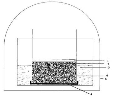 Для моделирования условий разложения растительного материала в водоеме на твердом грунте применяли разработанную нами установку: пластиковый цилиндр из химически инертного материала высотой 10-15 см, на нижний конец которого надета сетка, наполовину заполняли кварцевым песком (промытым и простерилизованным в сушильном шкафу при температуре 105ºС в течение 8 часов). Биомассу исследуемых цианобактерий распределяли по поверхности песка. Цилиндр помещали в кристаллизатор со стерильной водопроводной водой, налитой на несколько миллиметров ниже уровня поверхности песка. Сверху вся установка была закрыта стеклянным колпаком. Схема установки представлена на рис. 1. Эксперимент проводили при температуре 20ºС в течение месяца.