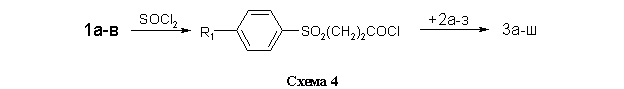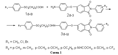 На схеме 1 представлена реакция получения библиотеки структурных аналогов с имидным и сульфонильным фрагментами 3а-ш. В качестве реагентов были использованы ароматические сульфопропионовые кислоты 1а-в и аминофенокси-N-фенилфталимиды 2а-з (таблица).