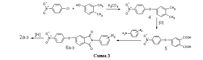 Соединения 2а-з получали на основе п-нитрохлорбензола и 3,4-ксиленола, через стадии образования 4-нитро-3/,4/диметилдифени-локсида 4, 4-нитрофеноксифталевой кислоты 5 и нитрофенокси-N-фенилфталимидов 6а-з (схема 3) по методикам, изложенным в работах [12,13].
