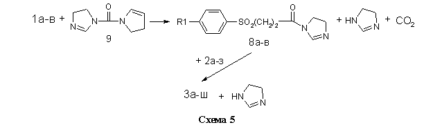 Во втором случае (метод Б, см. Экспериментальную часть) в качестве электрофильного ацилирующего агента использовались не хлорангидриды кислот 7а-в, а их имидазолилы 8а-в, полученные взаимодействием 1а-в с N,N-карбонилдиимдазолом 9 в безводном диоксане. Ввиду малой основности 9 и слабого характера амидной связи в имидазолилах 8а-в, последние легко вступают в реакцию переамидизации с аминами 2а-з (схема 5).