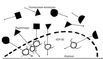 Среди всех этих общезащитных белков HSP-90 выделяется одной уникальной особенностью. Он не занимается защитой образующихся белковых молекул. Подавляющее большинство его „подопечных“ белков относится к классу так называемых передатчиков сигнала (signal transducers). Типичным примером таких передатчиков являются рецепторы клетки. Рецепторы — это белки, назначение которых состоит в распознавании специфических молекул, плавающих в межклеточном пространстве, и соединении с теми из них, которые определённым образом „соответствуют“ данному рецептору. Белок-рецептор имеет удлинённую форму: его „головка“, как грибок, торчит над поверхностью клетки, „тельце“ пронизывает её клеточную мембрану, а „хвост“ находится внутри клетки.