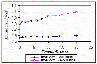 На рис. 3 приведены данные по влиянию добавок глины на насыпную и кажущуюся плотность катализатора. В интервале концентраций глины от 1 до 20 % насыпная плотность катализатора увеличивается незначительно, от 0,5 до 0,6 г/см3. Кажущаяся плотность, которая косвенно характеризует пористость катализатора, в том же интервале концентраций глины увеличивается от 0,8 до 1,0 г/см3.