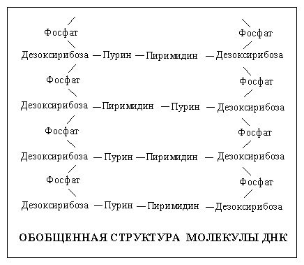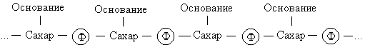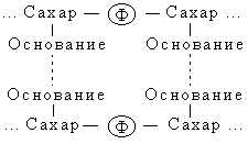 Символ Ф обозначает фосфатную группу. Чередующиеся остатки сахара и фосфорной кислоты образуют сахарофосфатный остов молекулы, одинаковый у всех ДНК, а огромное их разнообразие обусловливается тем, что четыре азотистых основания могут располагаться вдоль цепи в самой разной последовательности.