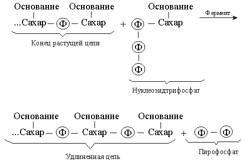 Репликация и транскрипция. С химической точки зрения синтез нуклеиновой кислоты – это полимеризация, т.е. последовательное присоединение строительных блоков. Такими блоками служат нуклеозидтрифосфаты; реакцию можно представить следующим образом: